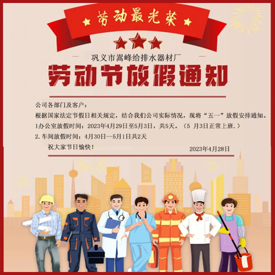 2.車間放假時(shí)間:4月30日--5月1日共2天,